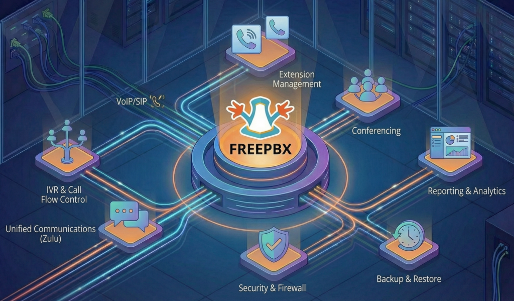 Mit FreePBX hast du eine Profi-Anlage, die alles kann: Warteschleifen, Ansagen, Mailbox-to-Email und Homeoffice-Integration. Verbinde deine Festnetznummer mit jedem Endgerät weltweit – flexibel und kosteneffizient.
